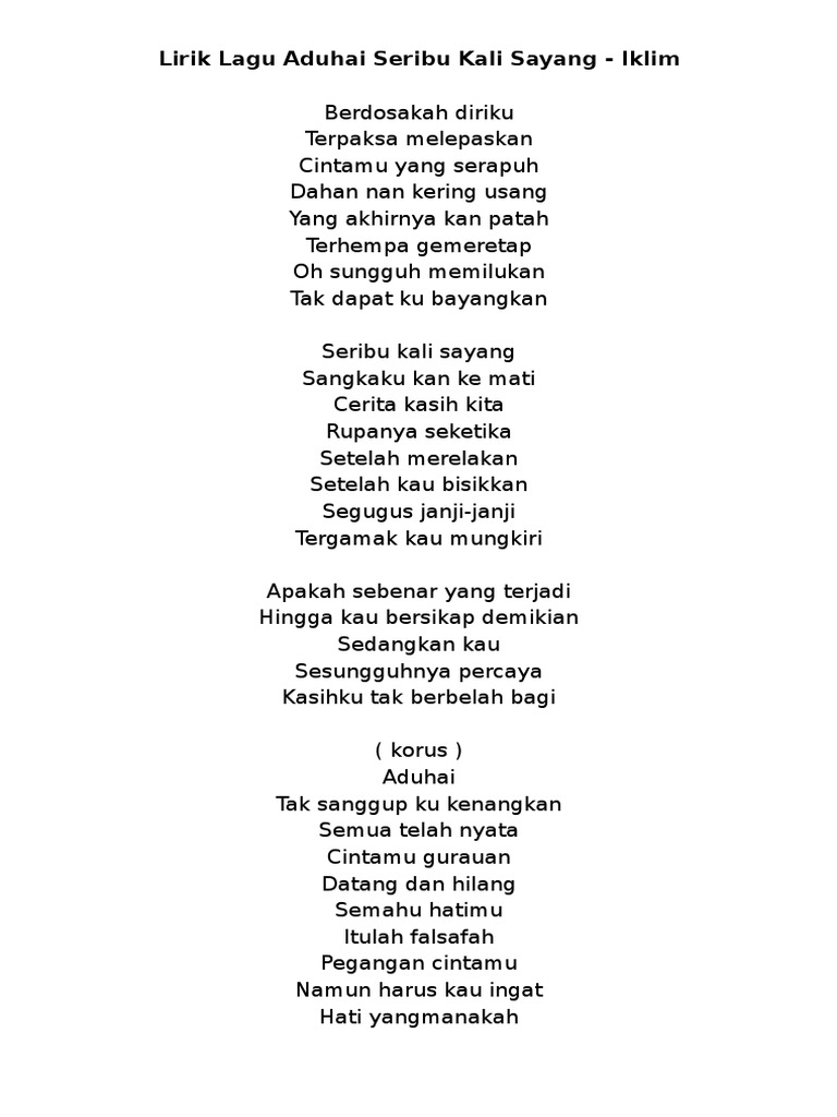 Am setelah kau bisikkan. Lirik Lagu Malaysia Iklim Aduhai Seribu Kali Sayang Berdosakah diriku Terpaksa melepaskan Cintamu yang serapuh Dahan nan kering usang Yang akhirnya kan patah Terhempa gemeretap Oh sungguh memilukan Tak dapat ku bayangkan Seribu kali sayang Sangkaku kan ke mati Cerita kasih kita Rupanya seketika Setelah merelakan Setelah kau bisikkan. Yang akhir nya kan patah Terhempas gemeretap Oh sungguh memilukan Tak dapat ku bayangkan.